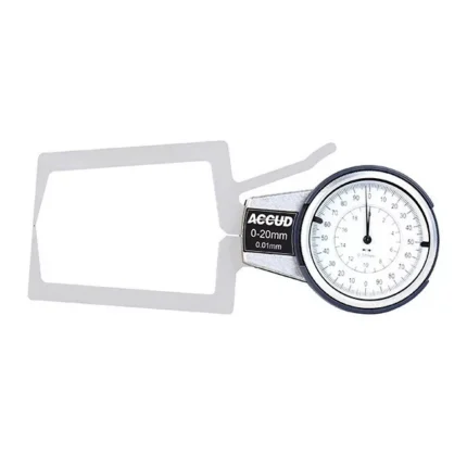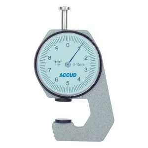 Un mesureur d'épaisseur à cadran est un instrument mécanique utilisé pour mesurer précisément l'épaisseur d'un objet ou d'un matériau. Il comporte un cadran analogique ou montre avec une aiguille qui indique la mesure, une sonde de contact qui se déplace perpendiculairement à l'objet et une construction robuste souvent en métal. On retrouve ce principe sur le pied à coulisse à montre.