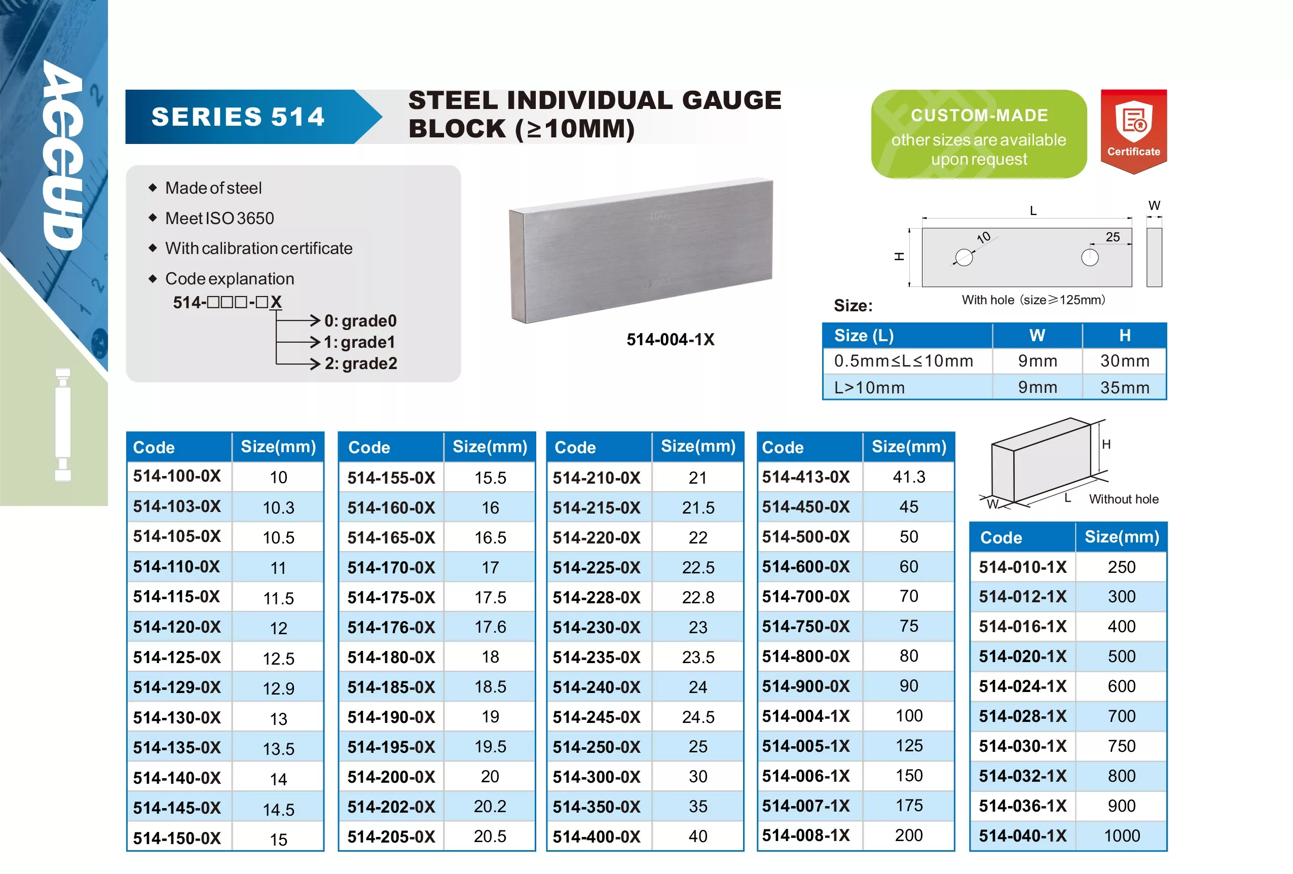 Cale étalon individuelle en acier de 10mm à 1000mm, classe 0 / 1 / 2