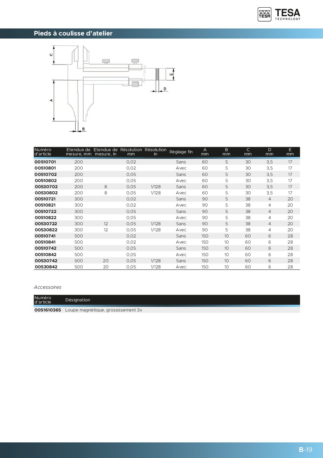 Pied à coulisse à vernier d’atelier TESA avec ajustement fin et avec ou sans double résolution