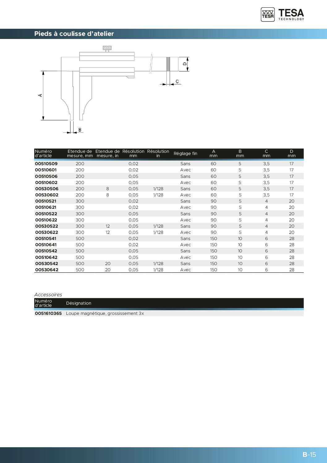 Pied à coulisse à vernier d’atelier TESA, avec ou sans double résolution
