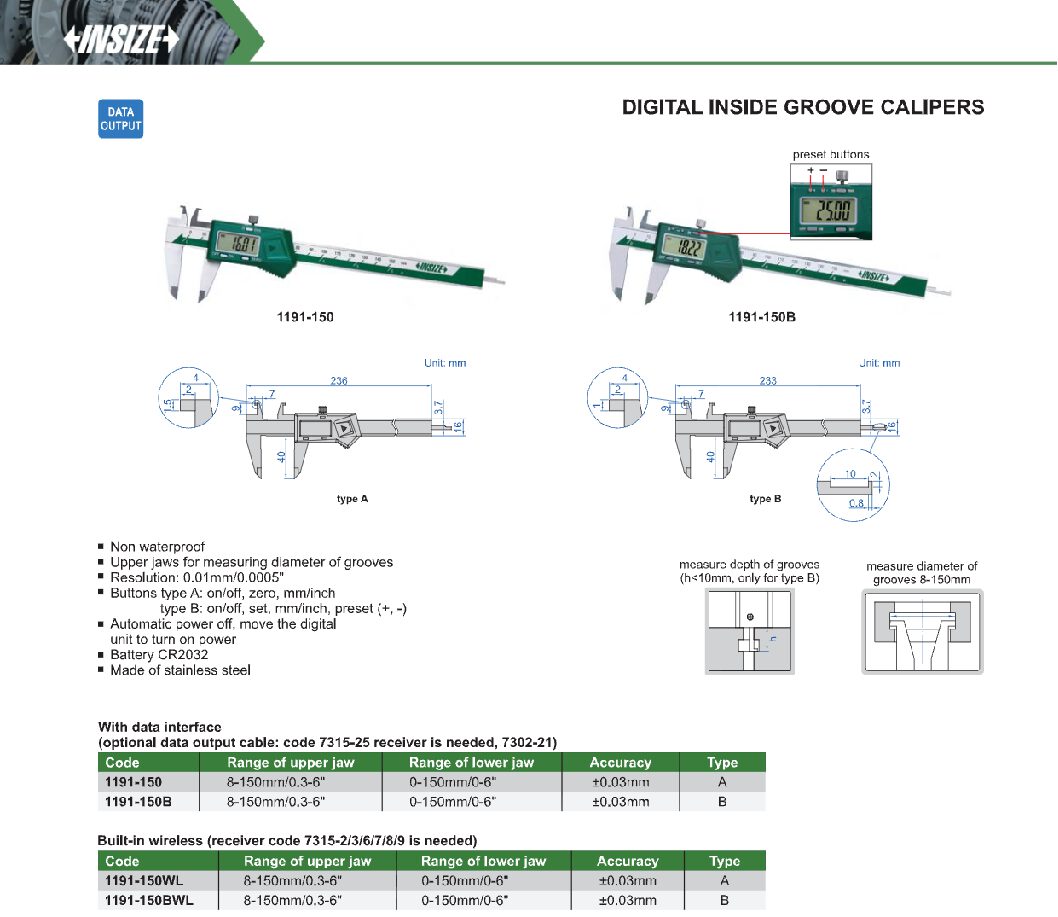 Pied à coulisse numérique double becs et jauge de profondeur pour rainure intérieure INSIZE